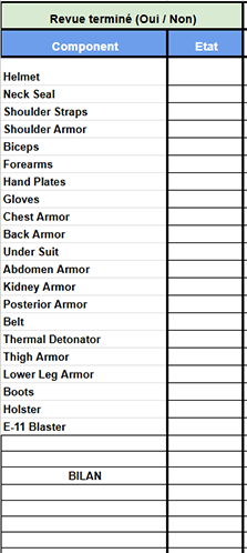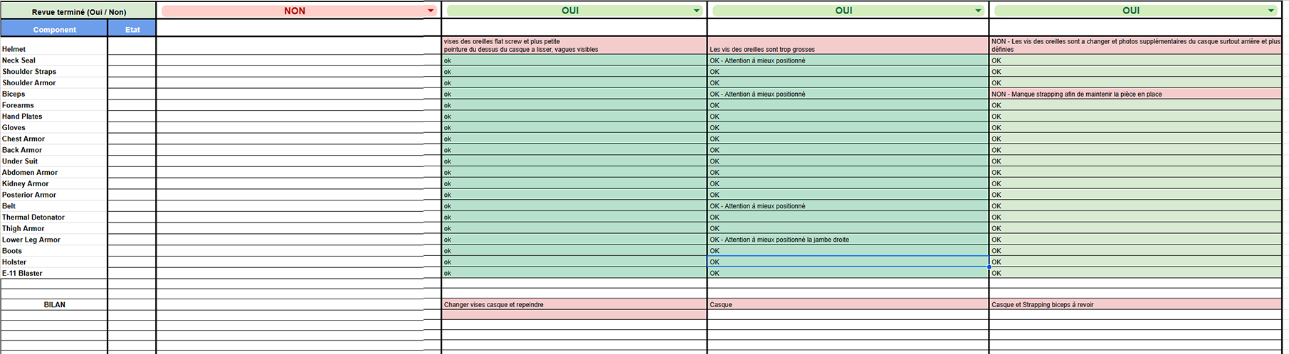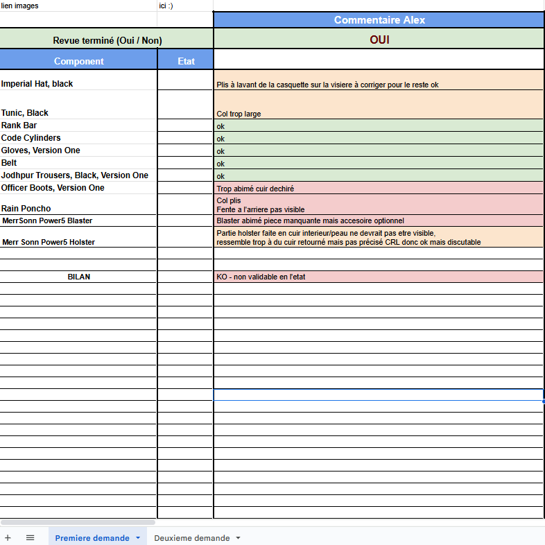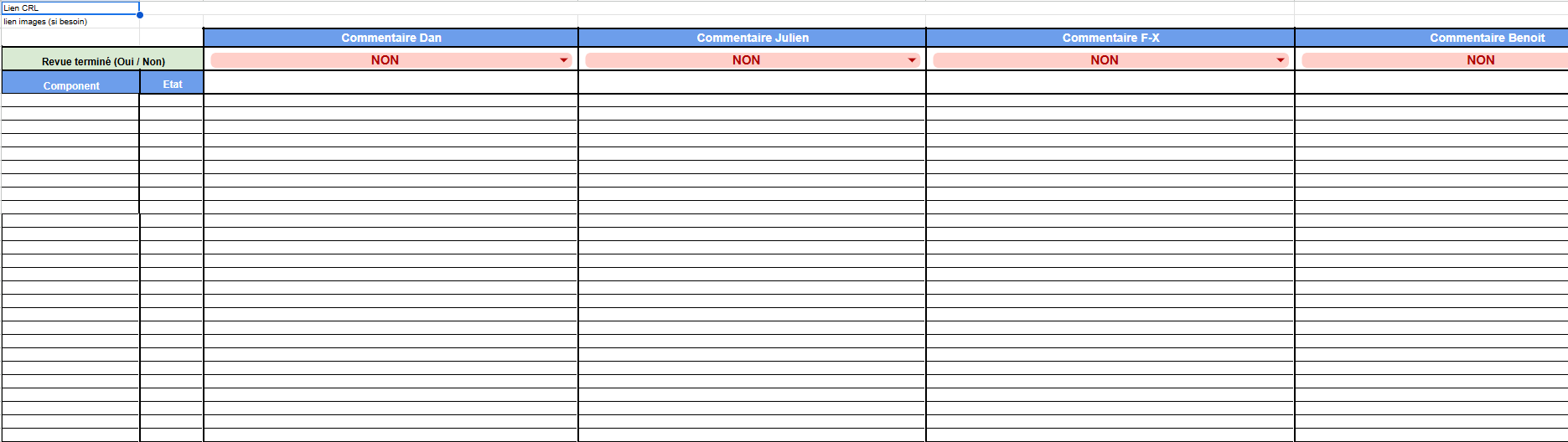 Puis, dans le drive consacré aux GML, une fiche est créée. Sur cette fiche on va y retrouver les colonnes pour les reviews, la liste des éléments du costume de la CRL, le nom de la CRL et le lien associé