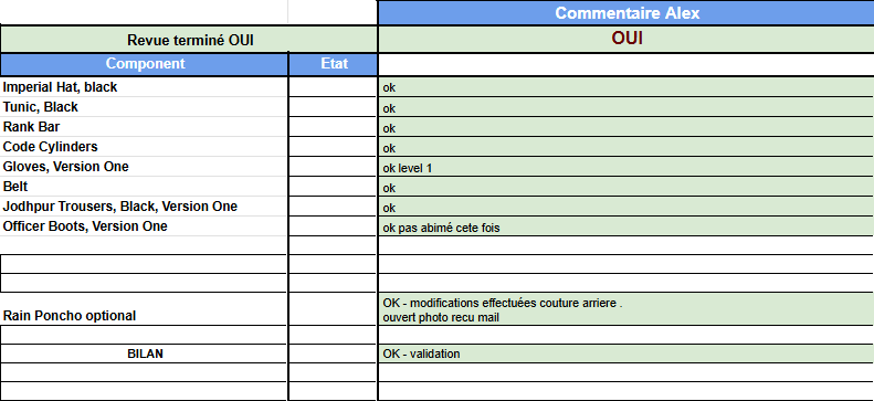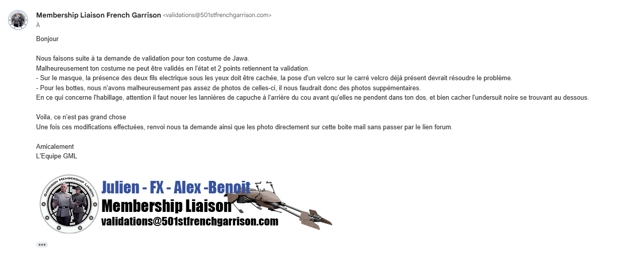 Si la validation du costume est refusée, les GML listent les modifications à effectuer, dans l'attente du retour du candidat.
