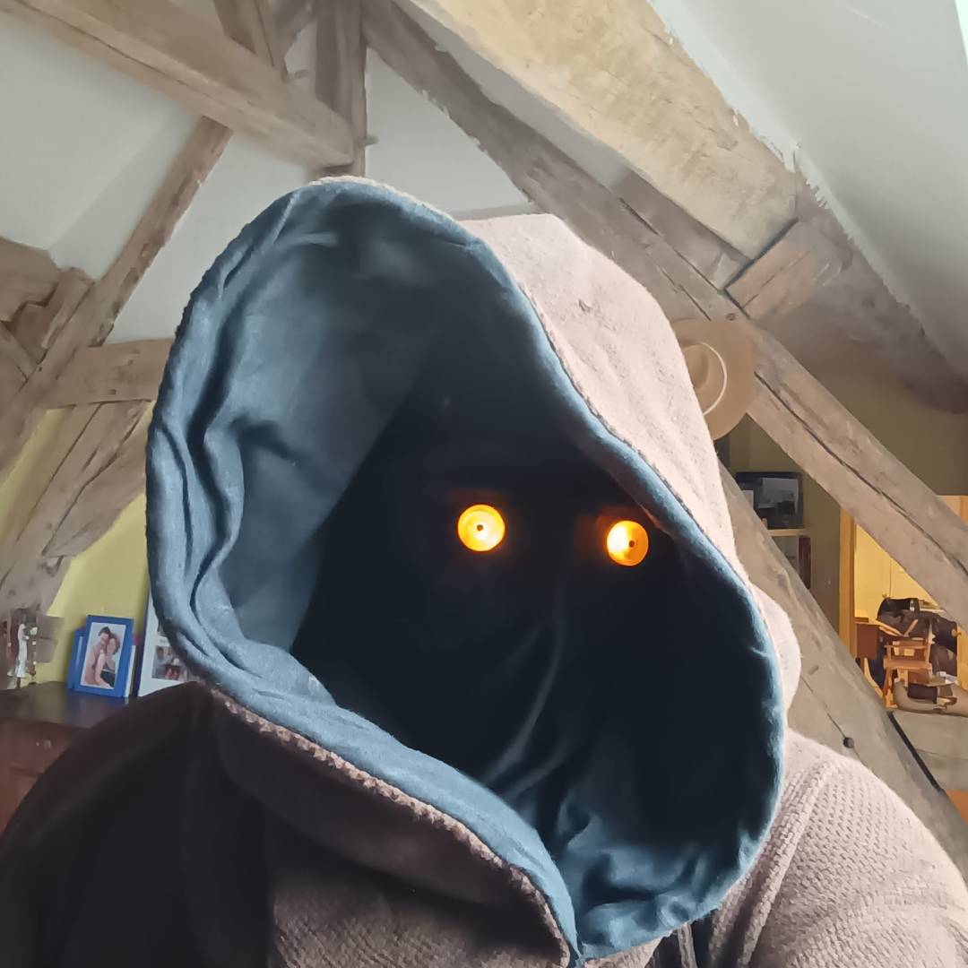 - cagoule en lycra fin, avec deux trous en lin noir pour les yeux. Les yeux lumineux sont des Leds alimentées par une pile bouton 3v qui se porte en collier sous la robe.
